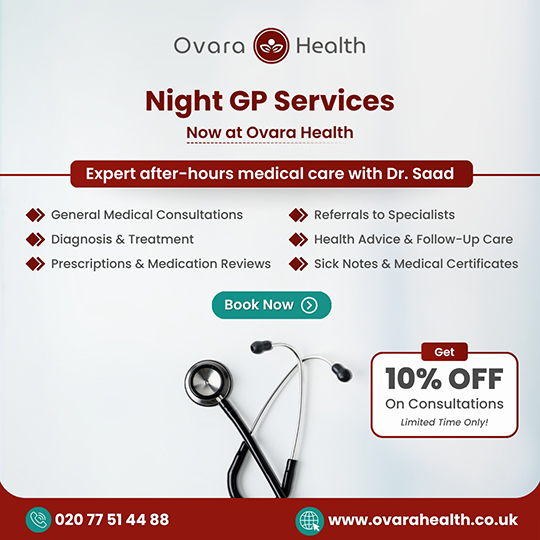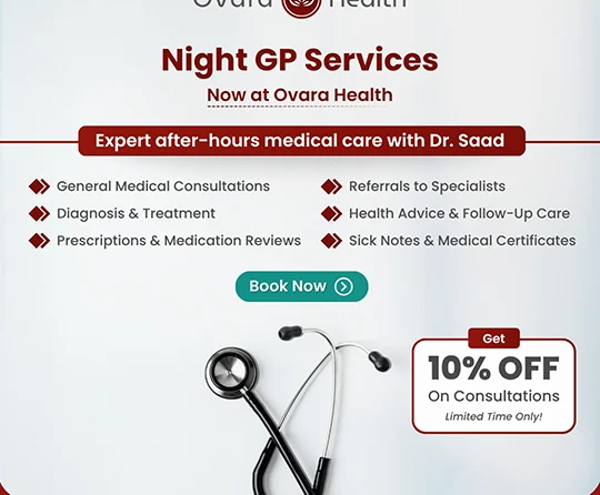 At Ovara Health, we know that health concerns can arise anytime often when most clinics are closed. To ensure you always have access to medical care, we offer dedicated Night GP Services with Dr Saad, available Friday to Sunday, from 7 pm to 11 pm.